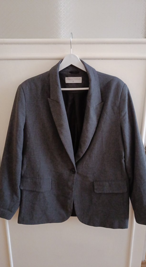 Gri renkli, keten kumaştan yapılmış, düğmeli ve kesik yakalı kadın blazer ceket. Normal kesim ve uzun kolludur, ofis kullanımı için uygundur. URBAN FOCUS L beden
