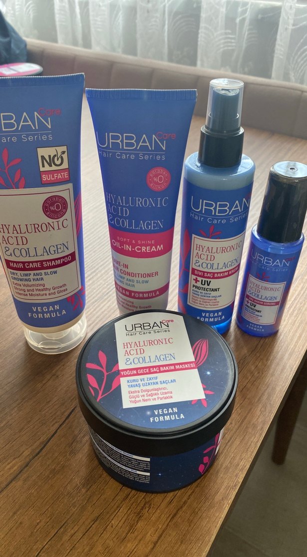 Urban Hyaluronic Acid & Collagen serisi, sülfatsız şampuan, 2'si 1 arada krem, koruyucu sprey, serum ve saç maskesinden oluşur. Vegan formüllü, yumuşak ve parlak saçlar için.