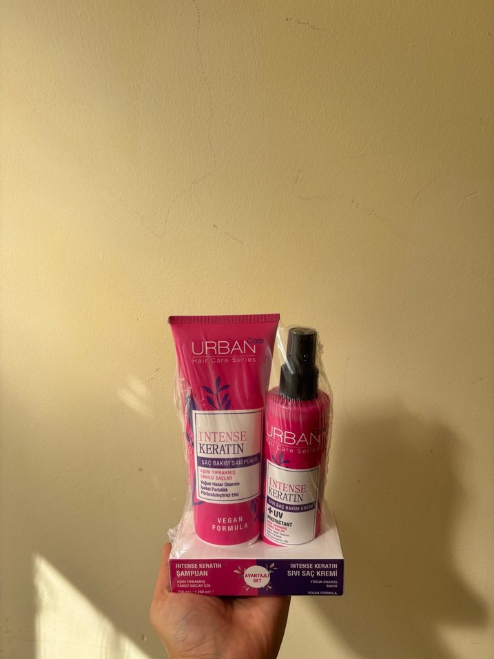 Urban Intense Keratin saç bakım seti, şampuan ve sıvı saç kreminden oluşur. Saçı güçlendirir ve korur, vegan formüle sahiptir. Saçıma uygun olmadığı için satıyorum hiç açılmadı