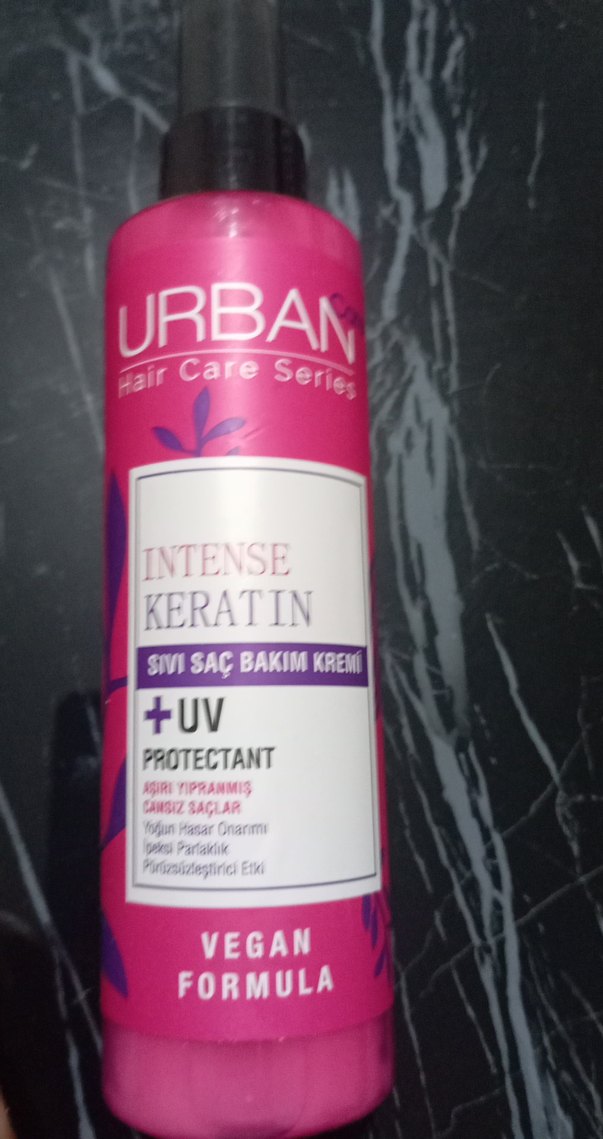 Urban Intense Keratin sıvı saç bakım kremi, UV koruyucu ve vegan formülüyle yıpranmış saçları besler, korur ve parlaklık verir.