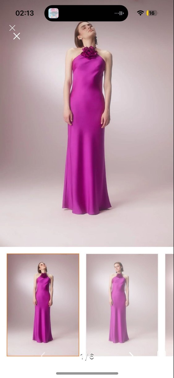 Uzun, kolsuz mor elbise, tekne yaka ve vücuda oturan kesime sahiptir. İpeksi kumaştan yapılmış, drapeli tasarımıyla düğünler için uygundur. Satendir. İlk foto elbise formu için eklendi. Somon renktedir