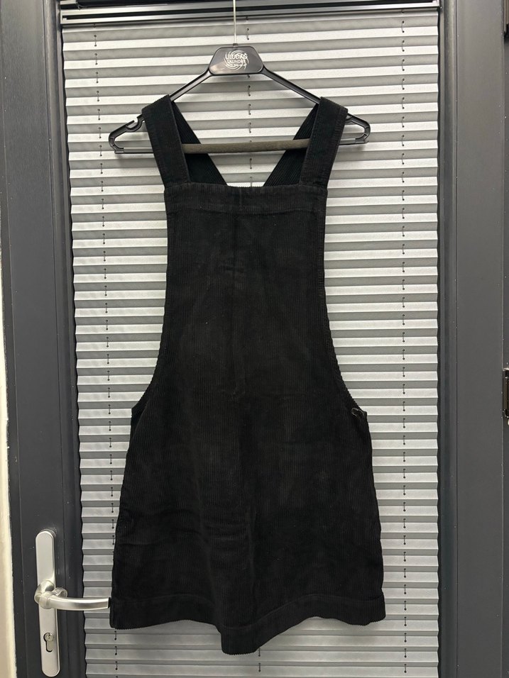 Siyah süet kumaştan, askılı ve yüksek yakalı, tokalı detaylara sahip, vücuda oturan kadın midi salopet. Günlük kullanım için uygundur. Altı etekli sadece etiketi çıkartıldı