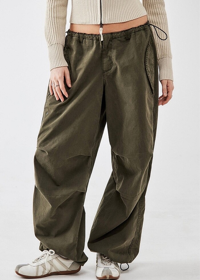 Haki y2k baggy tech cepli oversize kalıp beli ve paçası lastikli ayarlanır şekilde Urban Outfitters pantolon