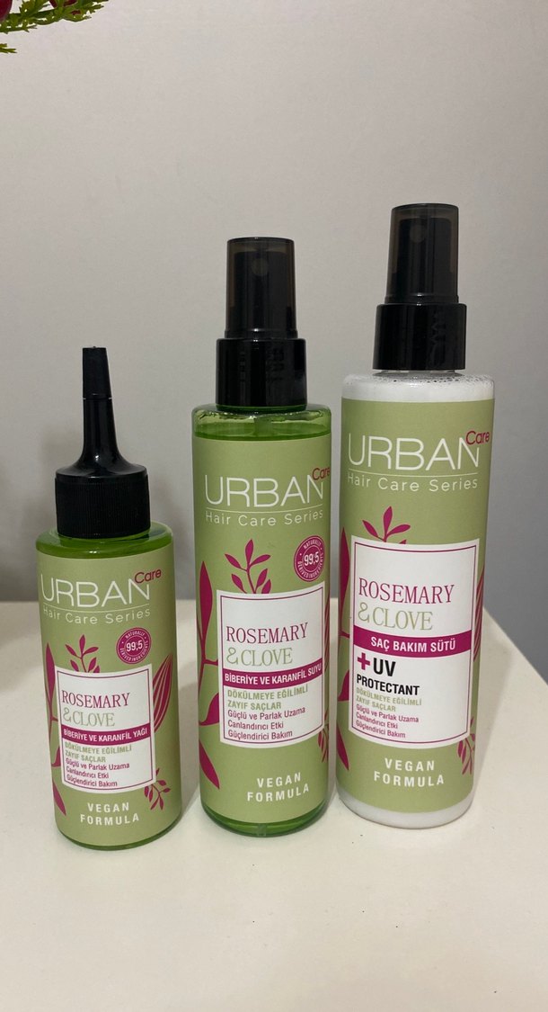 Urban Saç Bakım Serisi, biberiye ve karanfil içeren besleyici yağ, saç spreyi ve UV korumalı saç bakım sütü içerir. Vegan formüllü, saç güçlendirme ve parlaklık sağlar.