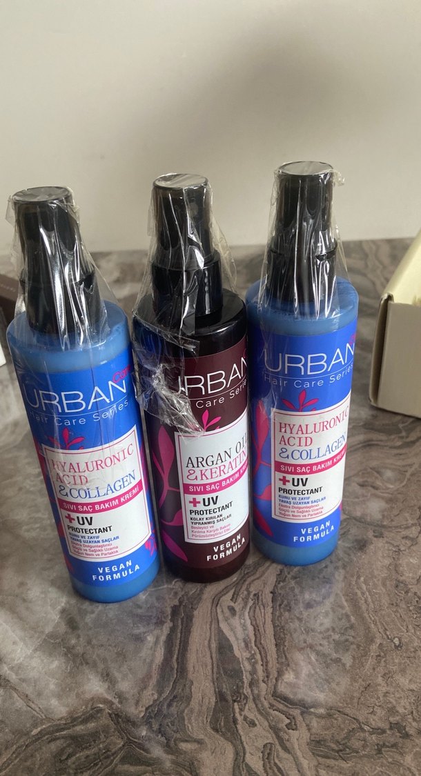 Urban saç bakım spreyleri, hyaluronik asit, kolajen, argan yağı ve keratin içerir. UV koruması ve vegan formüle sahiptir. Saç bakım ve koruma için uygundur.