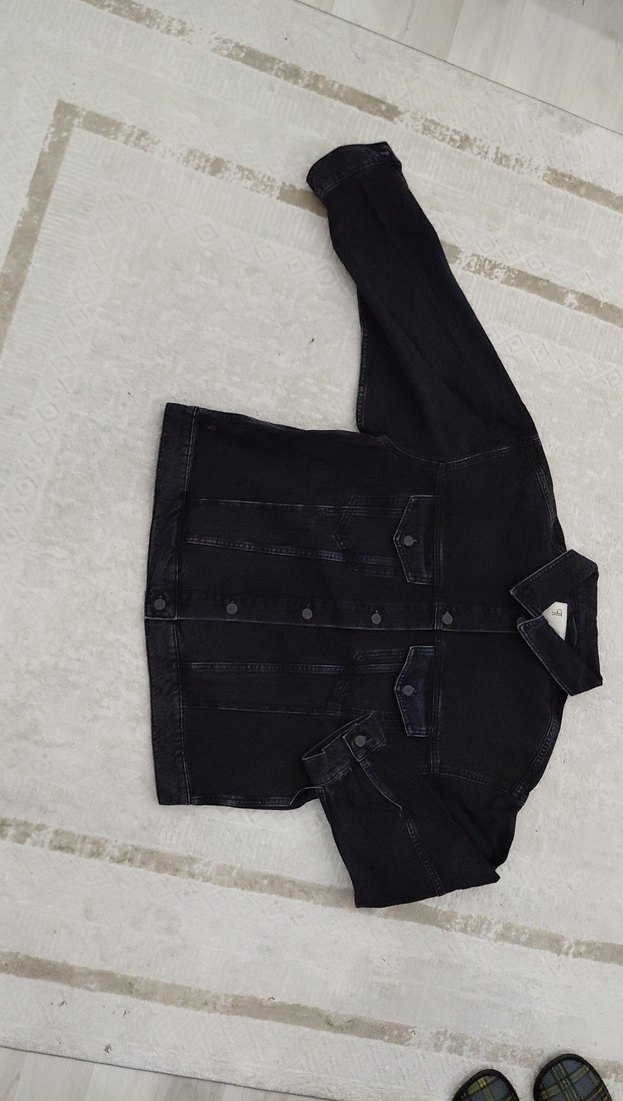 Siyah denim kumaştan, düz kesim ve uzun kollu, yaka detayı bulunan düğmeli kadın ceket. Günlük rahat stil için uygundur.