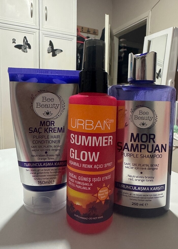 Urban güneş ışığı etkisi sprey hiç kullanılmadı bu spreyden 1 tane bitirdim mor şampuan ve saç kremi ile desteklemeniz gerekiyor yoksa saç turunculaşıyor sprey full dolu saç kremi ful dolu şampuanın yarısı dolu ürünlerin piyasa değeri toplam 700 800 tl arası saç rengimi değiştirdiğim için satıyorum alana hayırlı olsun