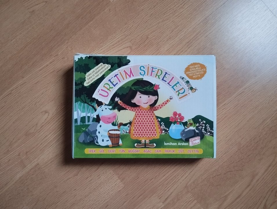 İsmihan Arslan'ın "Üretim Şifreleri" çocuk kitabı ipek, gül, deri, yün, buğday, ağaç, çam, pamuk, süt ve zeytin gibi doğal üretim süreçlerini anlatır. Test kitapcigi dahil degil
