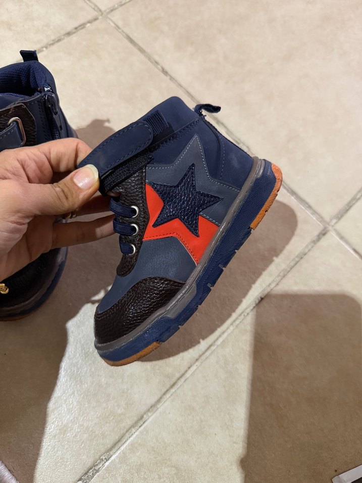 Mavi, yıldız desenli erkek çocuk botları, kauçuk tabanlı ve cırt cırtlı, günlük sokak stiline uygun.