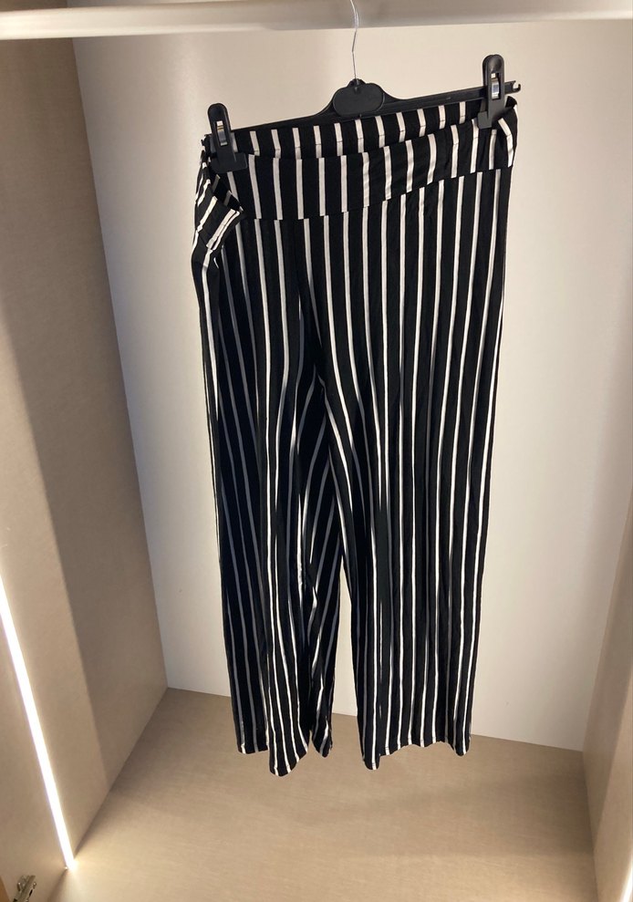 Siyah beyaz dikey çizgili, pilili, midi uzunlukta, bol kesim kadın pantolonu. Sentetik kumaştan üretilmiş, günlük kullanıma uygun, Paris sokak modası tarzında. Bel KISMINDA KÜÇÜK BİR DEFO VAR