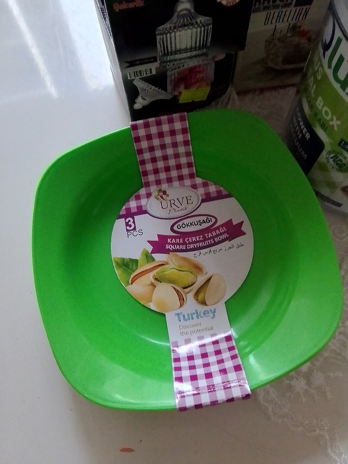 URVE markasına ait, Türkiye'de üretilmiş 3 parçadan oluşan pastel haki kare tatlı ve kurabiye tabakları seti.marka temsil mıka