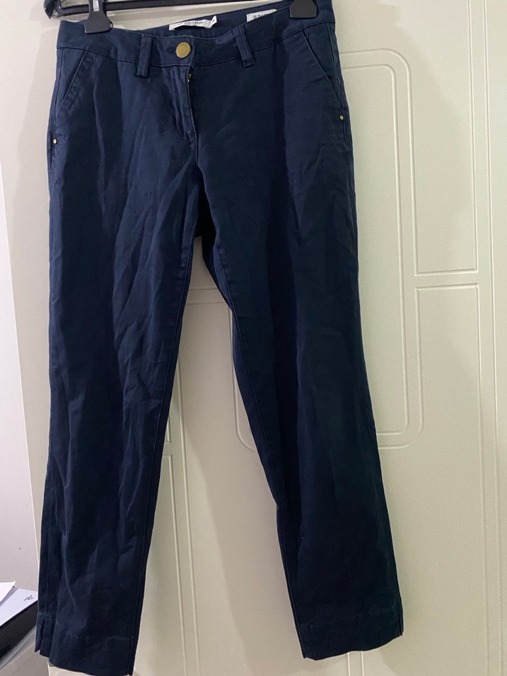 Düğmeli, normal boy lacivert denim pantolon, rahat kesim ve desensiz tasarımla günlük kullanıma uygun.