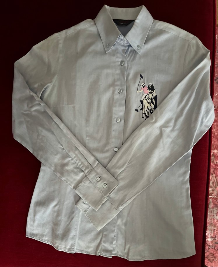 Mavi pamuklu gömlek, uzun kollu, yakalı ve düğmeli. Göğüs kısmında baskı detayı bulunur, normal kesimdir ve ofis ile günlük kullanım için uygundur. Az kullanıldı temiz