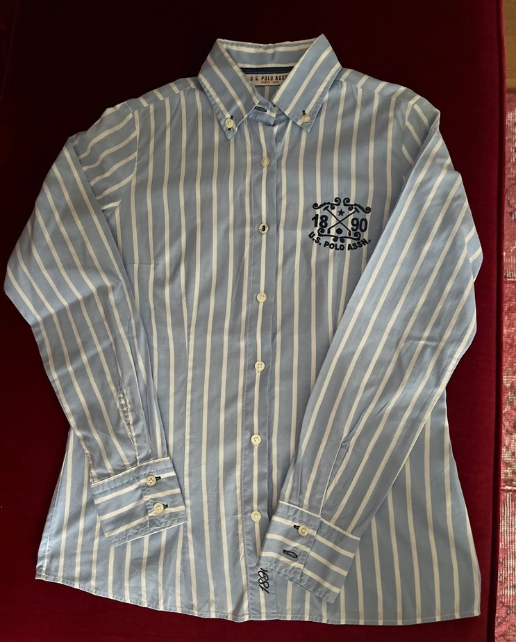 Pamuklu, uzun kollu, mavi ve beyaz çizgili kadın gömleği. Düğmeli ve yakalı, normal boyda, rahat kesim. Ofis kullanımı için uygun. Az kullanıldı temiz.