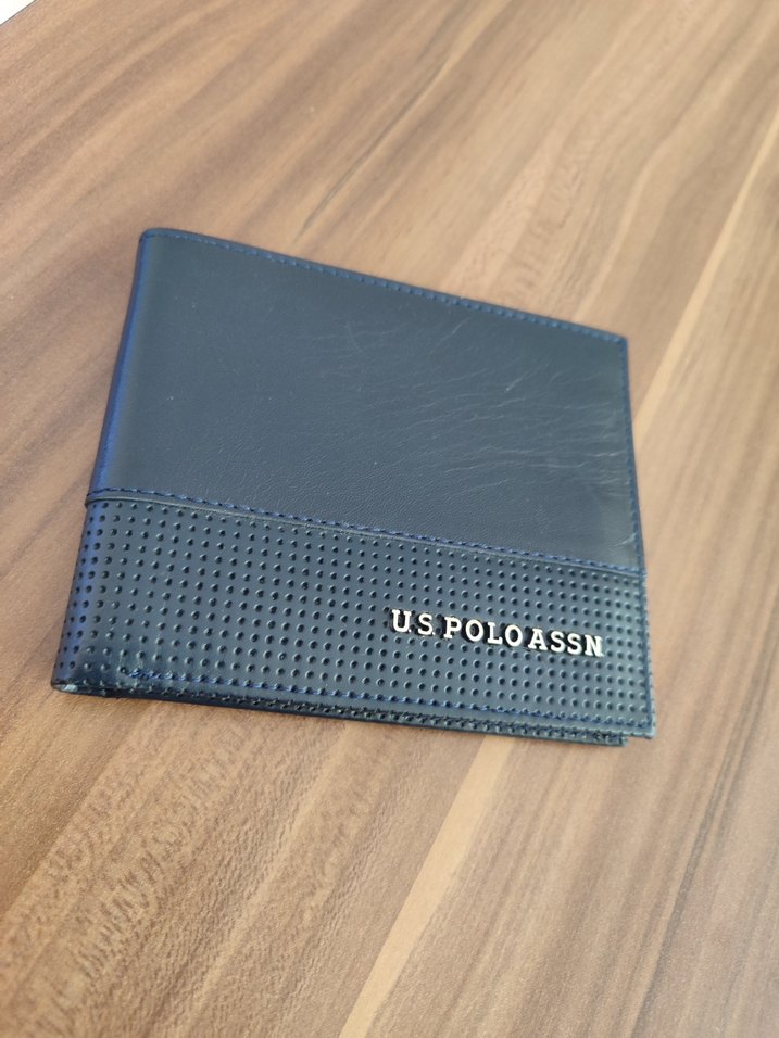 US Polo Assn markalı, lacivert renkli, baskılı dokulu erkek cüzdan, modern klasik tarzda ve iş kullanımı için uygun.