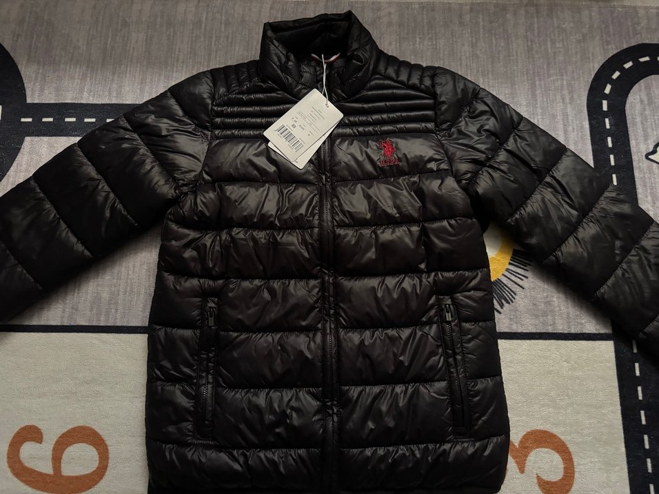 Fermuarlı ve uzun kollu, siyah renkte, normal midi uzunlukta, yumuşak ve sıcak kumaştan yapılmış erkek çocuk mont. İki koltuk altı arası 42 cm boyu 57 cm #çocukmont #çocuk #mont #uspolo
