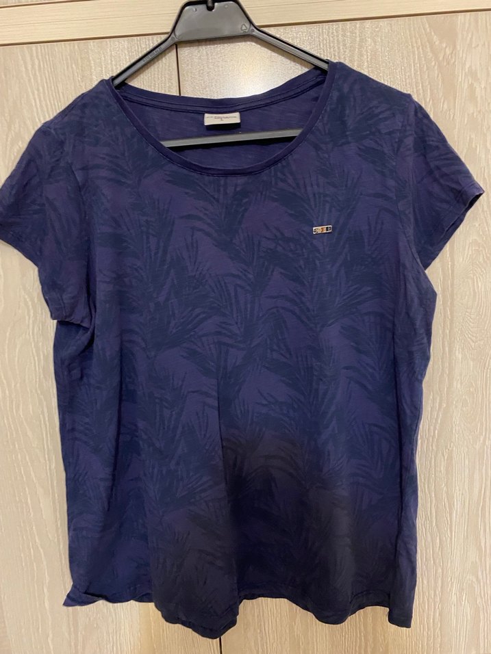 Lacivert baskılı, kısa kollu, bol kesim kadın tişörtü. İki kol altı arası 51 ve boyu 62 cm
