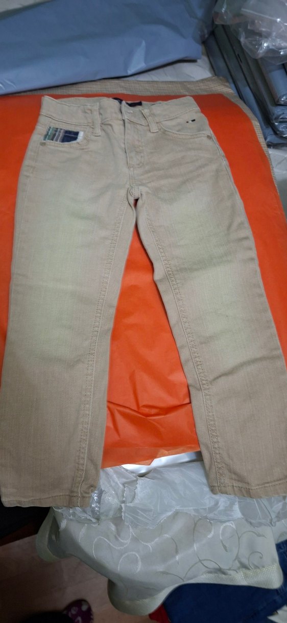 Bej renkli, düğmeli ve düz desensiz erkek çocuk denim pantolonu, rahat normal kesim sunar.