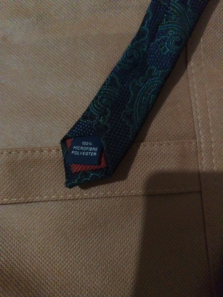 Koyu tonlarda, çok renkli ve hafif desenli erkek iş kravatı, %100 mikro fiber polyesterden yapılmıştır.