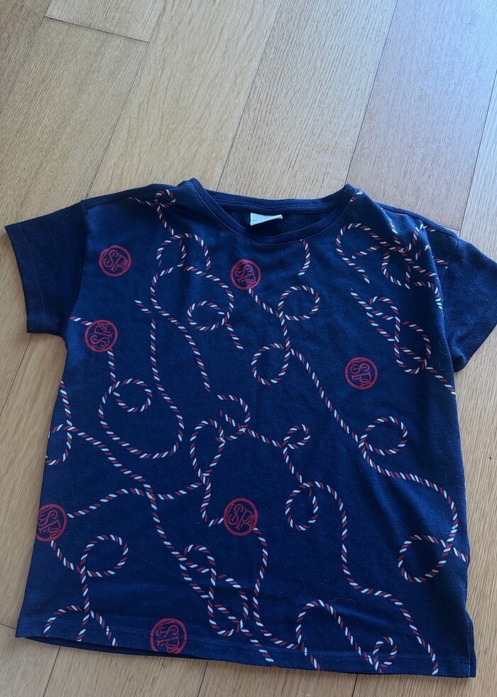 Hem rahat hem şık bir çocuk tişörtü! Lacivert zemin üzerine halat desenleri ve kırmızı logo detaylarıyla enerjik ve dikkat çekici bir tasarıma sahip. Yumuşak kumaşı sayesinde oldukça konforludur. Temiz, az kullanılmış.