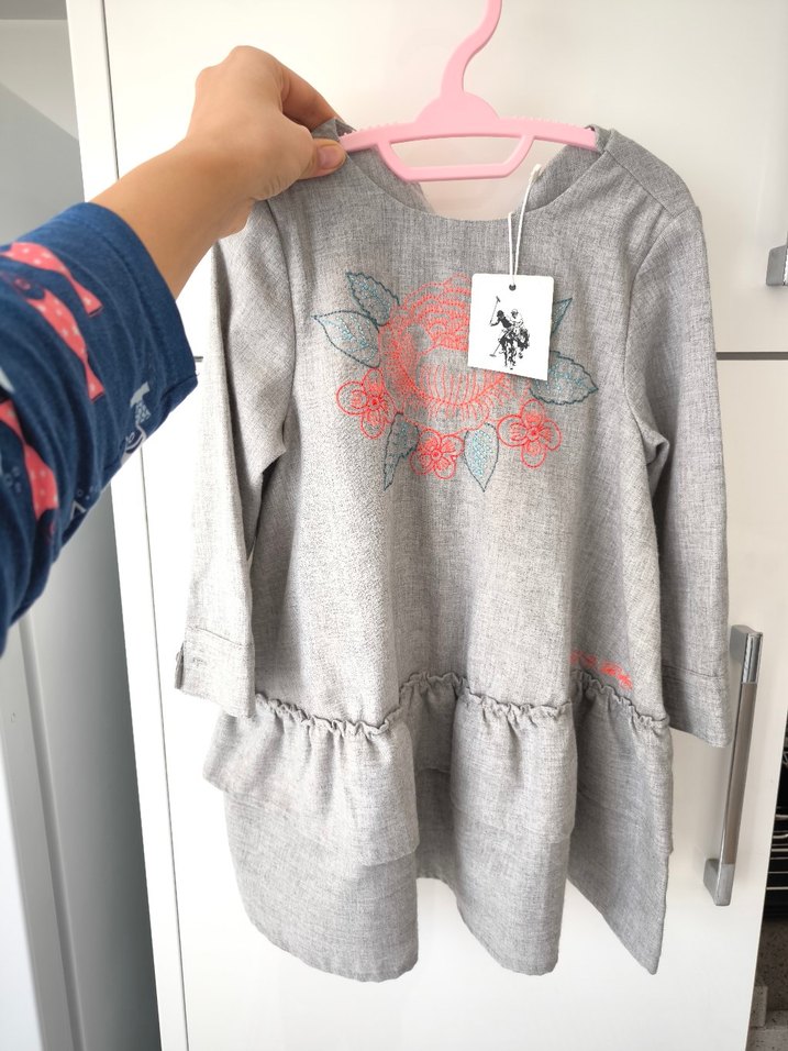 Gri renkte, uzun kollu ve yuvarlak yakalı, çiçek baskılı, bele fırfır detaylı bol kesim kız elbisesi. Yumuşak dokulu kumaştan yapılmıştır. 3,4 yastir