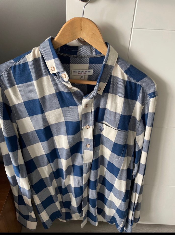 Mavi beyaz kareli, düğmeli, uzun kollu pamuklu hiçbir deformesi yok fazlalıktan satılık