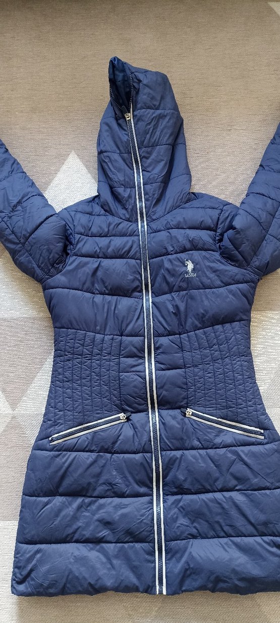 Fermuarlı, uzun kollu ve yakalı, mavi parlak renkte, yumuşak ve sıcak kumaştan yapılmış kadın kışlık mont.