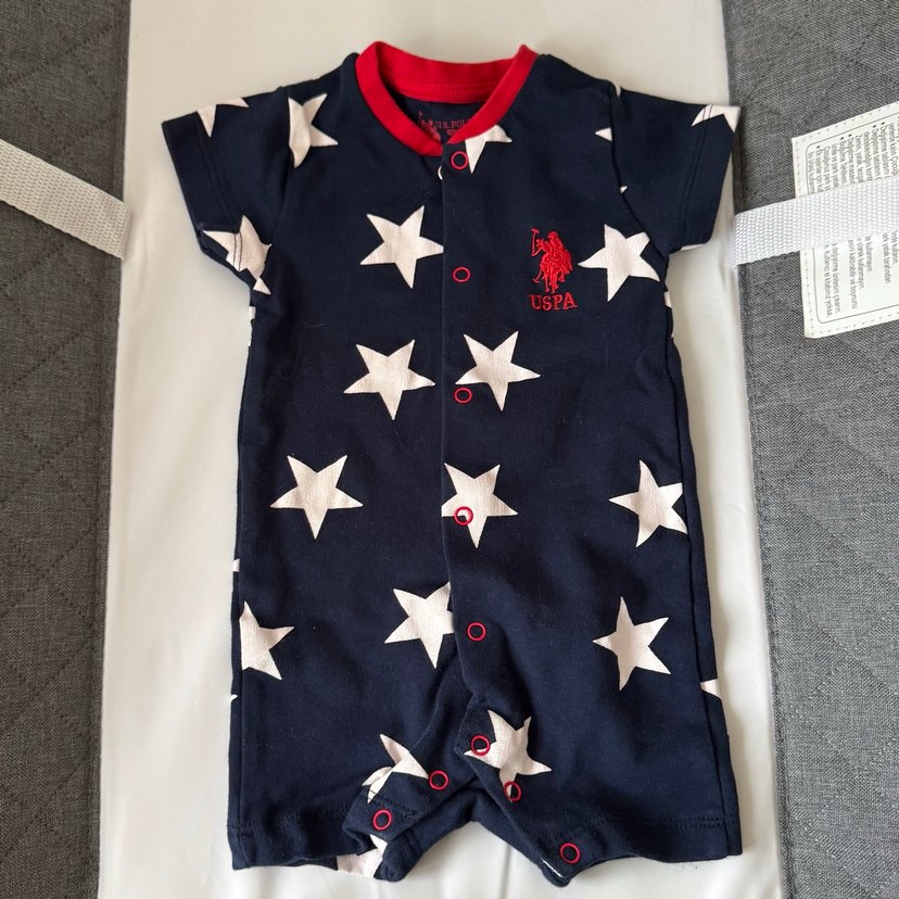 Koyu mavi renkli erkek bebek tulumu, kısa kollu ve çıtçıtlı ön kapamalıdır. Yumuşak ve sıcak kumaştan üretilmiş, büyük beyaz yıldız desenleriyle süslenmiştir.