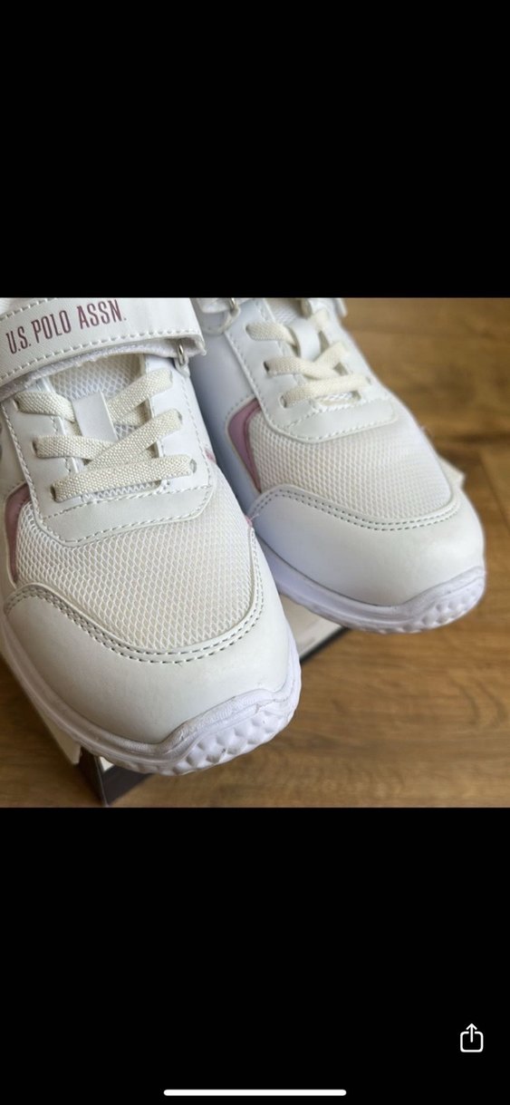 Beyaz renkli kız çocuk spor ayakkabısı, kauçuk tabanlı ve hafif desenlidir. U.S. Polo Assn. yazılı cırt cırtlı bant ve sokak stilinde tasarlanmıştır. Çok iyi durumda orjinal