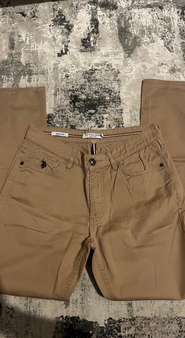 Acik Kahverengi, düğmeli, pamuk kumaştan yapılmış, günlük sokak tarzına uygun erkek pantolonu. Neredeyse hic giyilmedi. Sifirdan farksiz. Tertemiz urun.