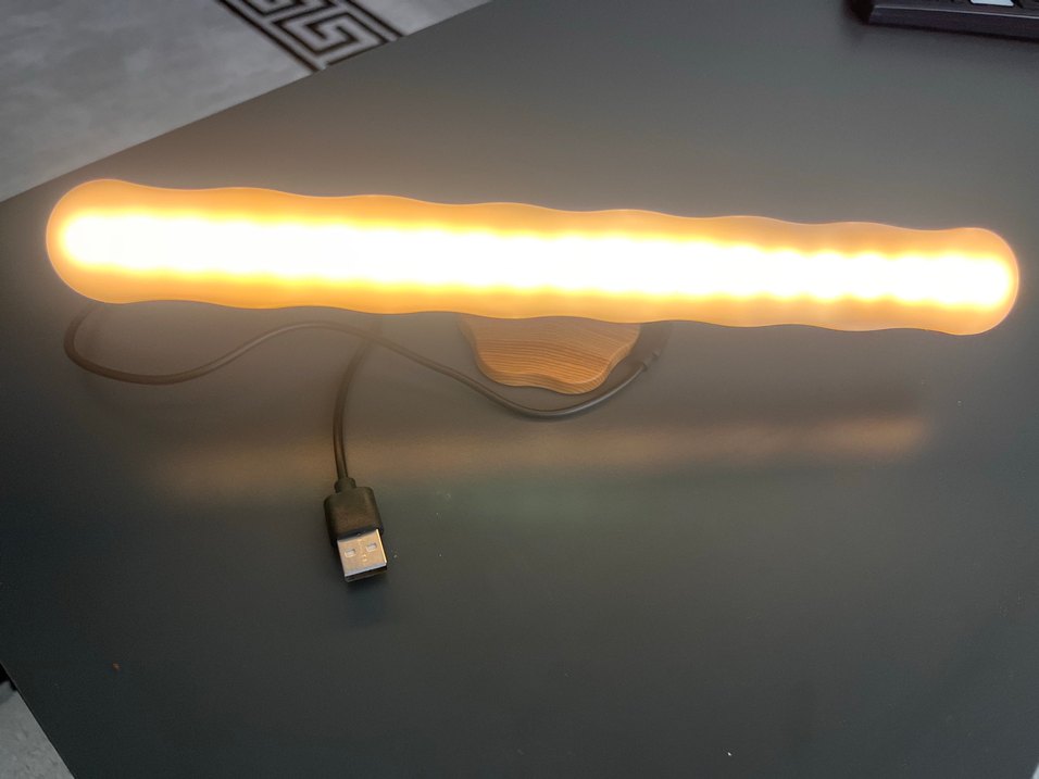 USB bağlantılı bej masa lambası, yumuşak ışık verir ve modern tasarıma sahiptir. Şarjlı aplik