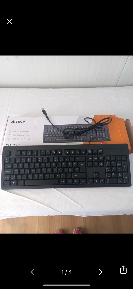 USB kablolu siyah A4Tech F klavye Tertemiz bir iki kez kullandım katiplik için almıştım vazgeçtim. Katiplik sınavı için uygundur. Sorunsuz ve kutuludur.İade kabul etmiyorum.