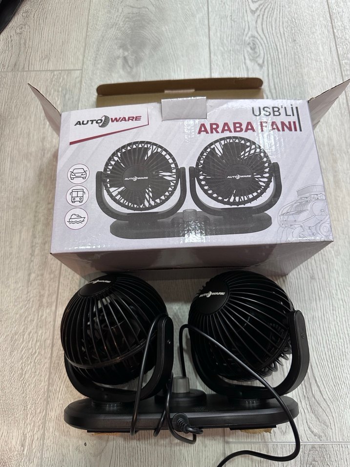 USB bağlantılı siyah çiftli araba fanı, ayarlanabilir hava akışı sağlar ve kolayca monte edilir. 3-4 kez kullanıldı aracı sattığımdan dolayı boşa çıktı sağlam 3 kademeli