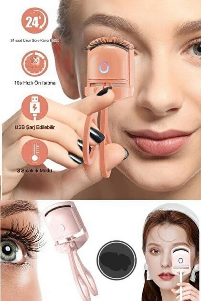 USB şarjlı, 10 saniyede hızlı ısınan, 3 sıcaklık modlu pembe kirpik kıvırıcı. Kalıcı kıvrım sağlar.