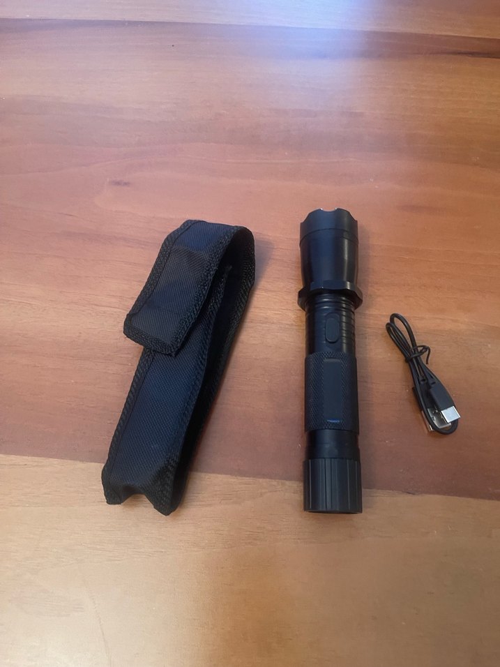 USB ile şarj edilen siyah el feneri, dokulu tutuş yüzeyi, siyah taşıma kılıfı ve USB şarj kablosu ile birlikte gelir. Elektroşok