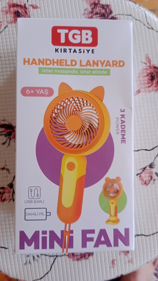 USB şarjlı, üç kademeli turuncu mini el vantilatörü. 6 yaş ve üzeri için uygundur, elde veya masada kullanılabilir. Taşıma için askı ipi bulunur.