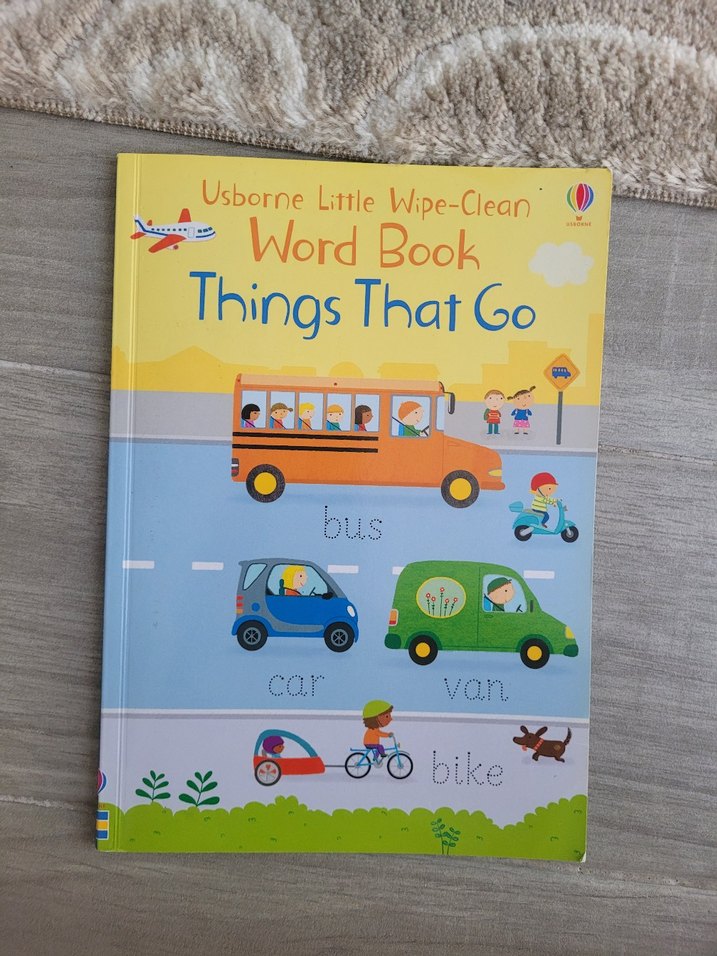 Usborne Little Wipe-Clean Word Book, otobüs, araba, minibüs ve bisiklet gibi araçların renkli illüstrasyonlarıyla çocukların öğrenmesini destekler.