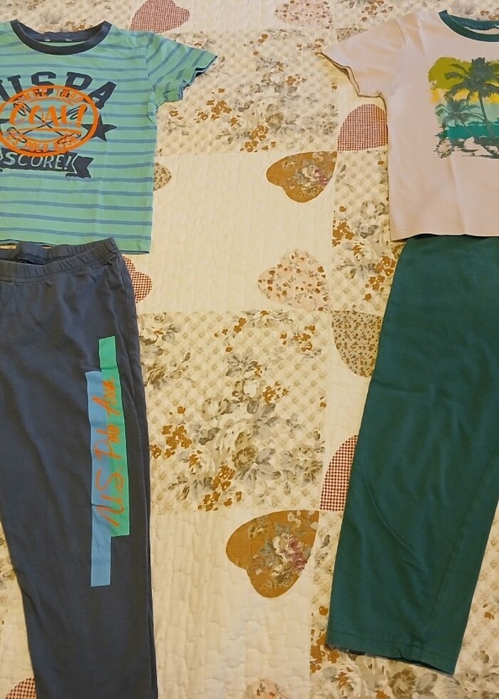 uspa 2 adet alt üst pijama takımı. yazın üst kısımlarını tshirt olarak kullanabilirsiniz tertemiz sorunduzdur. Bedeni 4 yaştır. Etiketlerini çocuk rahatsız oluyor diye kesmiştim.