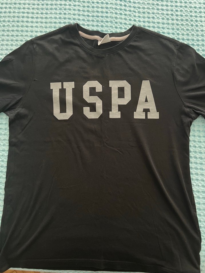 Siyah, kısa kollu, yuvarlak yaka erkek tişörtü. Rahat kesim ve USPA baskılı. Spor ve günlük kullanıma uygundur. Kol kısmında küçük bir yırtık onarılmıştır.