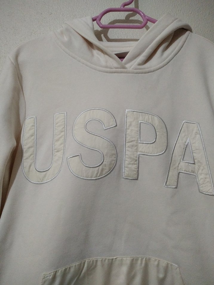 Beyaz, uzun kollu, yuvarlak yakalı kadın sweatshirtü. Baskılı USPA logosu ve salaş kesimiyle kısa ve rahat bir tasarım sunar. Günlük kullanıma uygun, şık ve rahat.