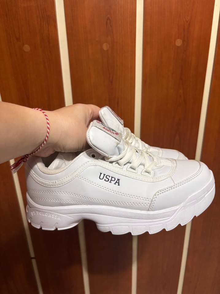 USPA markalı beyaz platform topuklu kadın spor ayakkabısı, kauçuk tabanlı ve desensiz şık tasarımlı, rahat ve trend sokak stili için uygundur.