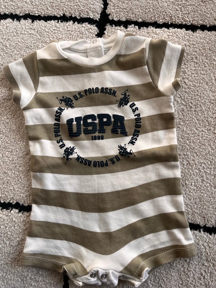 Tertemizdir kusuru yoktur. Kısa kollu, yuvarlak yakalı bebek body, yumuşak ve sıcak fleece kumaştan. Kahverengi ve gri çizgili, önünde baskılı USPA logosu ile rahat bir şıklık sunar.
