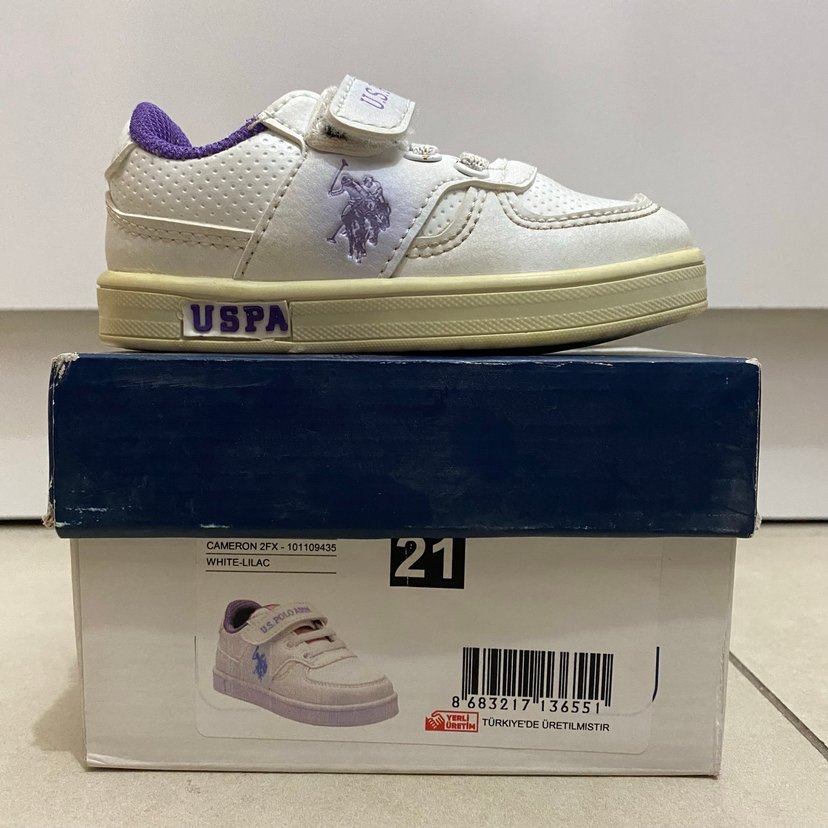 USPA markalı, beyaz ve lila renklerde, baskılı desenli, cırt cırtlı çocuk spor ayakkabısı. Kauçuk tabanlı, sokak stiline uygun.