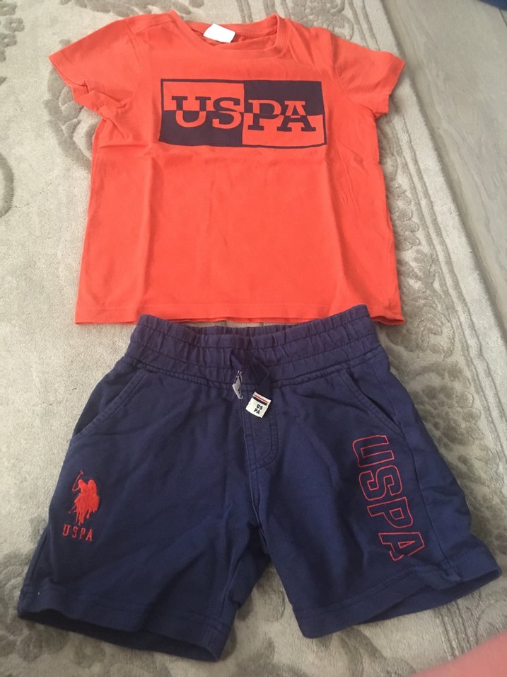 Kırmızı USPA baskılı tişört ve lacivert bol kesim USPA logolu şort, yumuşak kumaştan üretilmiştir. Sayili kez giyildi tertemiz
