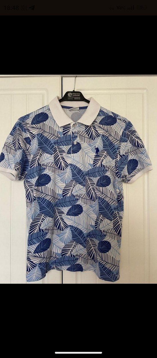 Bu erkek polo tişörtü, yakalı ve düğmeli öne sahiptir. Açık mavi tonlarında baskılı deseni ve sentetik kumaşı ile rahat sokak tarzına uygundur.