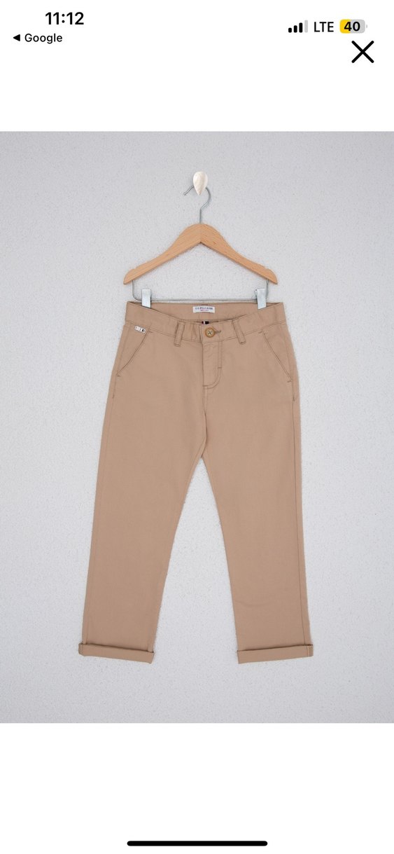 Erkek çocuklar için açık bej renkli, regular fit pamuk pantolon. Desensiz, ön cepli ve düğmeli, rahat ve şık normcore tarzda pantolon.