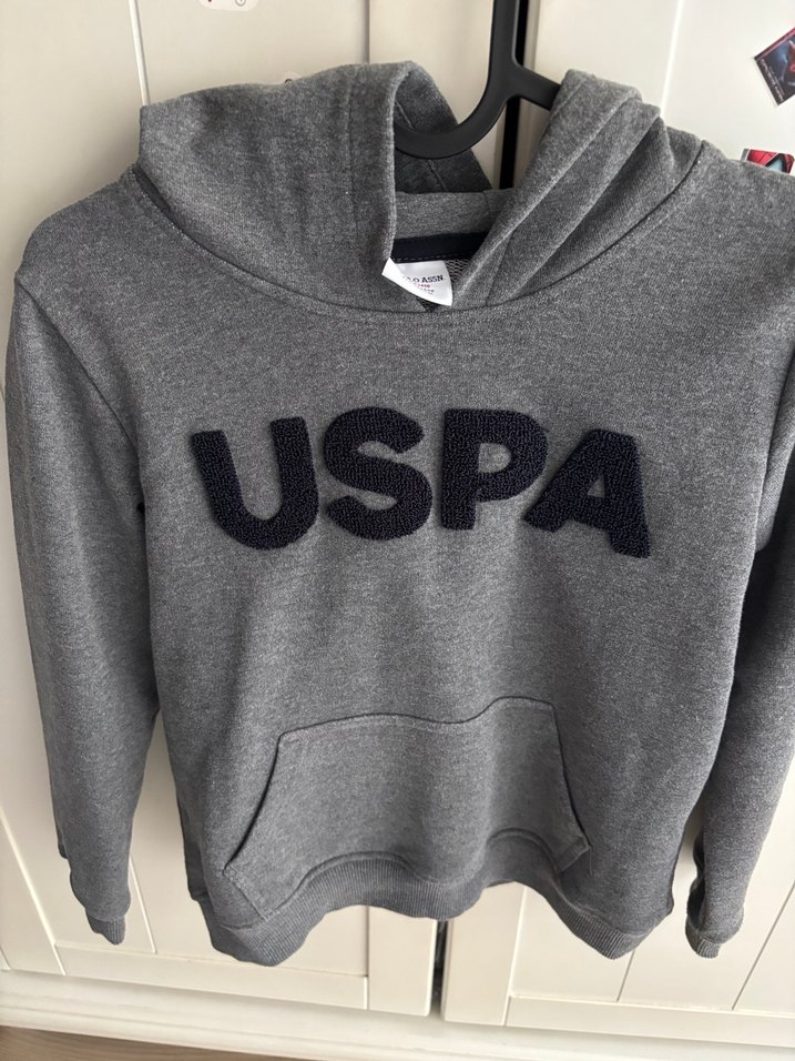 Gri renkli, USPA logolu, kapüşonlu erkek çocuk sweatshirtü. Yuvarlak yaka, uzun kollu ve bol kesim. Yumuşak, örme kumaştan üretilmiştir.