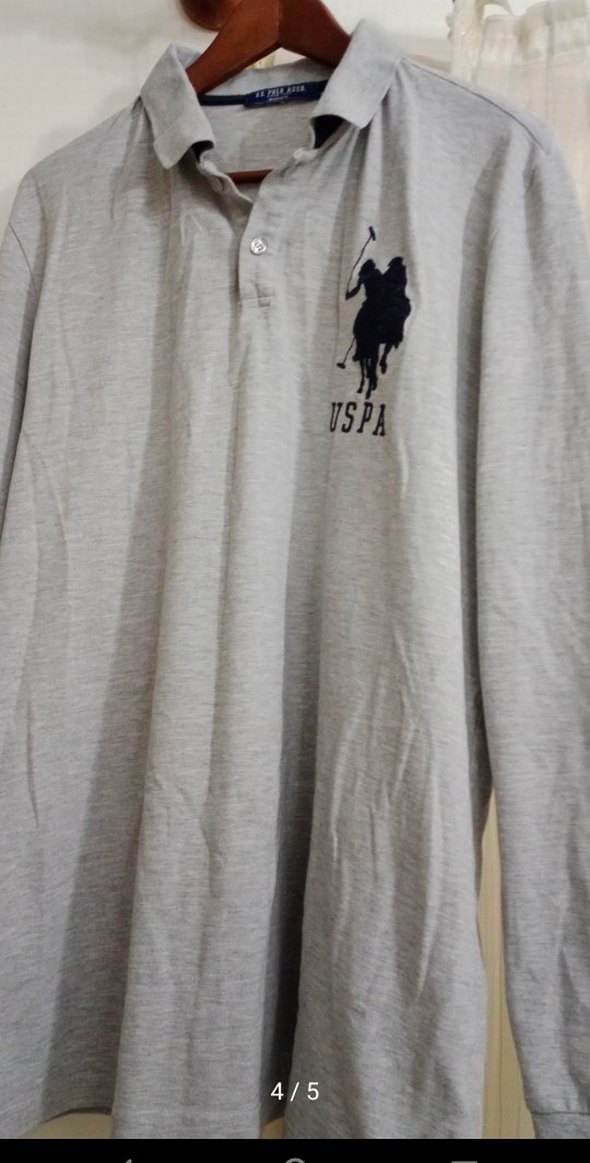 USPA baskılı, düğmeli gri uzun kollu polo tişört, bol kesim ve yuvarlak yakaya sahiptir. Sentetik kumaştan üretilmiştir.