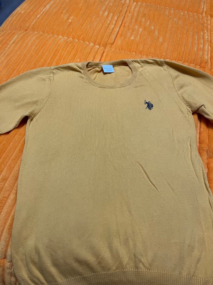 Sarı renkte ve yuvarlak yakalı erkek polo kazak Yumuşak ve sıcak kumaştan, bol kesim ve sade logo detaylı, günlük kullanıma uygun.
