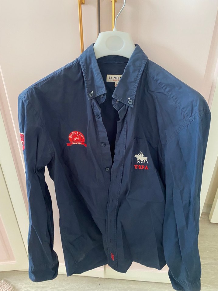 Lacivert denim kumaştan, uzun kollu, düğmeli ve yakalı erkek gömleği. Üzerinde baskılı USPA logoları vardır, rahat kesimlidir.